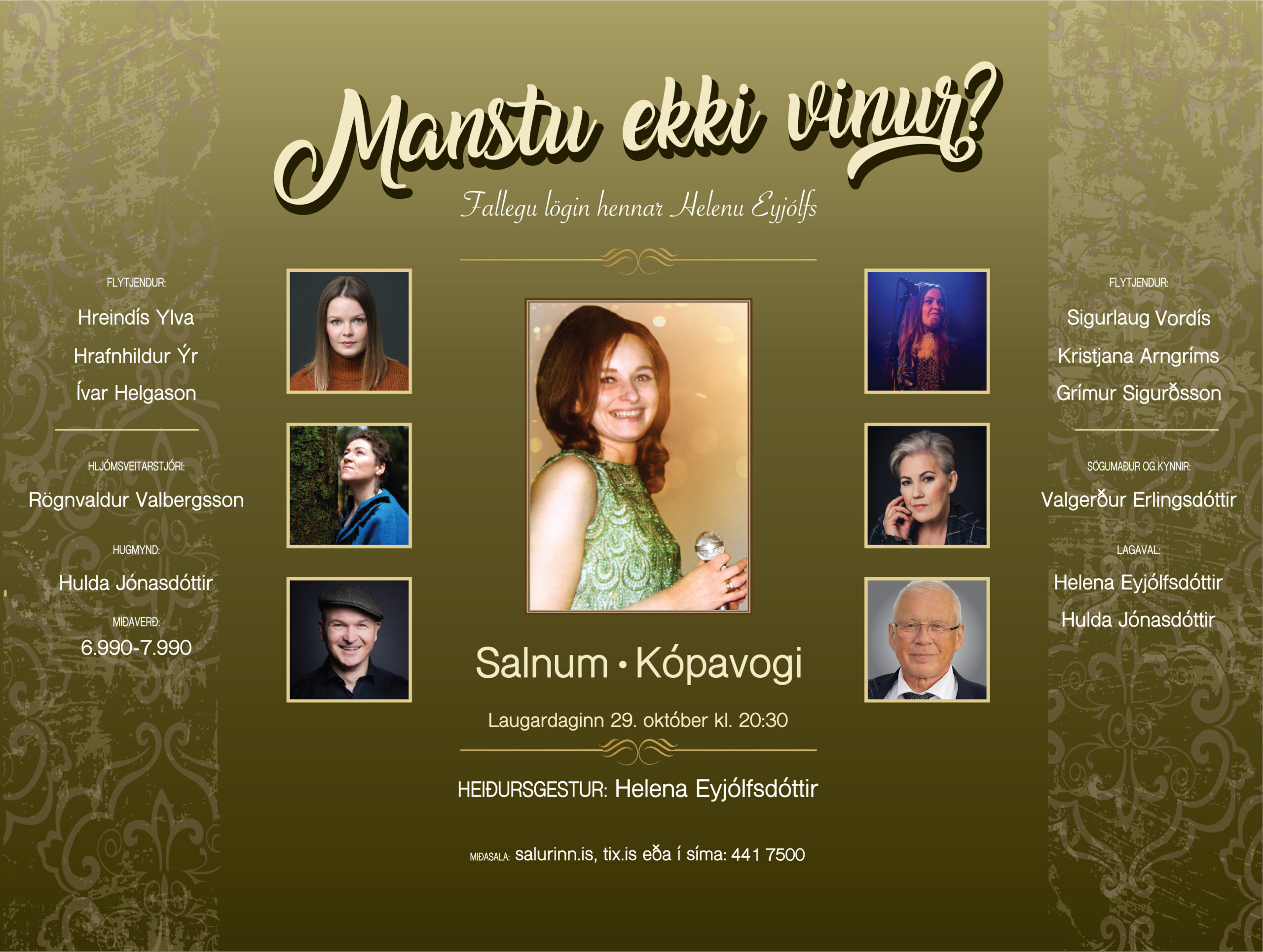 Helena Eyjólfsdóttir er ein ástsælasta söngkona þjóðarinnar, hún hefur staðið á sviðinu í marga áratugi og er fyrir löngu búin að syngja sig inn í hjörtu landsmanna með ógleymanlegum dægurlagaperlum. Á þessum einstöku tónleikum ætlum við að leyfa ykkur að heyra þær og rifa upp bæði í tali og tónum feril Helenu.